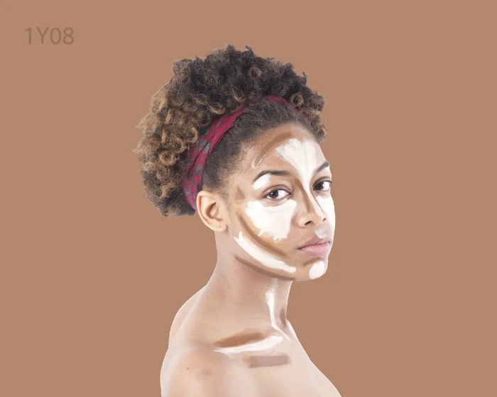 The text in the upper left hand corner signifies a specific shade in the Pantone foundation color chart. I utilized Pantone's Color IQ System to identify each person's shade and it serves as that individual's label in the series. My intent is to fill the entire chart Pantone chart with individuals.